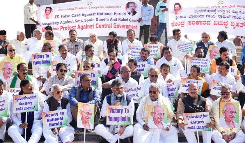 ಸುವರ್ಣ ವಿಧಾನಸೌಧ ಆವರಣದಲ್ಲಿರುವ ಮಹಾತ್ಮ ಗಾಂಧಿ ಪ್ರತಿಮೆ ಎದುರು ಮುಖ್ಯಮಂತ್ರಿ ಸಿದ್ದರಾಮಯ್ಯ ಹಾಗೂ ಉಪ ಮುಖ್ಯಮಂತ್ರಿ ಡಿ.ಕೆ. ಶಿವಕುಮಾರ್ ಅವರ ನೇತೃತ್ವದಲ್ಲಿ ಧರಣಿ ನಡೆಯಿತು.