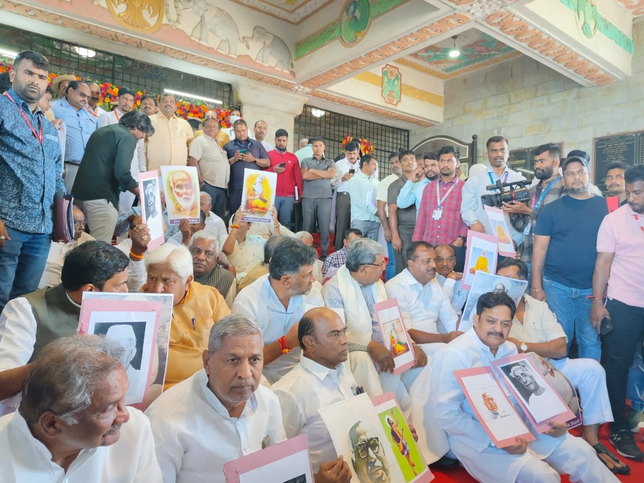 ವೀರ ಪುರುಷರ, ಮಹನೀಯರ ಭಿತ್ತಿಚಿತ್ರಗಳನ್ನು ಹಿಡಿದು ಕೆಪಿಸಿಸಿ ಅಧ್ಯಕ್ಷ ಡಿ ಕೆ ಶಿವಕುಮಾರ್, ವಿಧಾನಸಭೆ ವಿರೋಧ ಪಕ್ಷದ ನಾಯಕ ಸಿದ್ದರಾಮಯ್ಯ, ಕೆಪಿಸಿಸಿ ಕಾರ್ಯಾಧ್ಯಕ್ಷ ಸಲೀಮ್ ಅಹ್ಮದ್, ಸತೀಶ್ ಜಾರಕಿಹೊಳಿ, ಹಿರಿಯ ಮುಖಂಡರಾದ ಎಚ್ ಕೆ ಪಾಟೀಲ್, ಕೆ ಜೆ ಜಾರ್ಜ್, ಆರ್ ವಿ ದೇಶಪಾಂಡೆ, ಲಕ್ಷ್ಮೀ ಹೆಬ್ಬಾಳ್ಕರ್ ಮತ್ತಿತರ ಮುಖಂಡರು ಬೆಳಗಾವಿ ಸುವರ್ಣಸೌಧದ ಪ್ರವೇಶ ದ್ವಾರದಲ್ಲಿ ಸೋಮವಾರ ಬೆಳಗ್ಗೆ ಪ್ರದರ್ಶನ ನಡೆಸಿದರು.