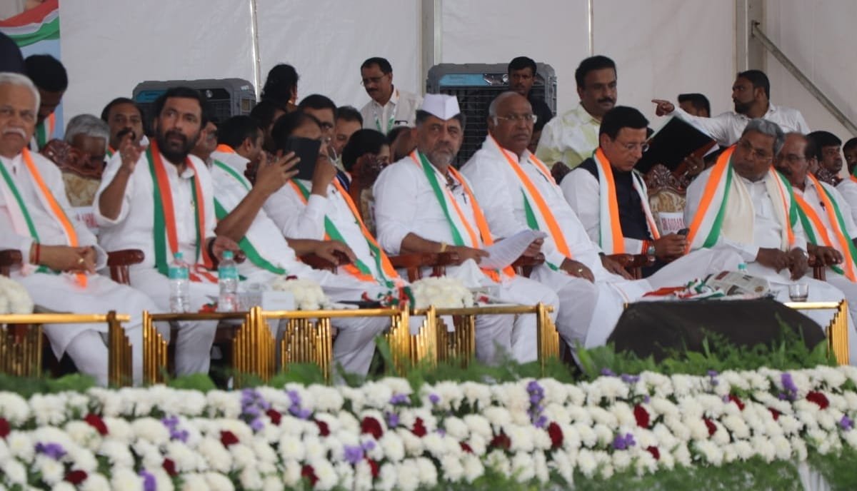ಮಂಗಳೂರು ಹೊರವಲಯದ ಅಡ್ಯಾರ್ನಲ್ಲಿರುವ ಸಹ್ಯಾದ್ರಿ ಕಾಲೇಜ್ ಬಳಿ ನಡೆದ ಕಾಂಗ್ರೆಸ್ ಕಾರ್ಯಕರ್ತರ ಸಮಾವೇಶದಲ್ಲಿ ಎಐಸಿಸಿ ಅಧ್ಯಕ್ಷ ಮಲ್ಲಿಕಾರ್ಜುನ ಖರ್ಗೆ, ಪ್ರದೇಶ ಕಾಂಗ್ರೆಸ್ ಉಸ್ತುವಾರಿ ಸುರ್ಜೇವಾಲ, ಮುಖ್ಯಮಂತ್ರಿ ಸಿದ್ದರಾಮಯ್ಯ, ಉಪಮುಖ್ಯಮಂತ್ರಿ ಡಿ.ಕೆ.ಶಿವಕುಮಾರ್ ಸೇರಿದಂತೆ ಸಚಿವರು, ಶಾಸಕರು ಕೆಪಿಸಿಸಿ ಧುರೀಣರನೇಕರು ಭಾಗವಹಿಸಿದ್ದರು.