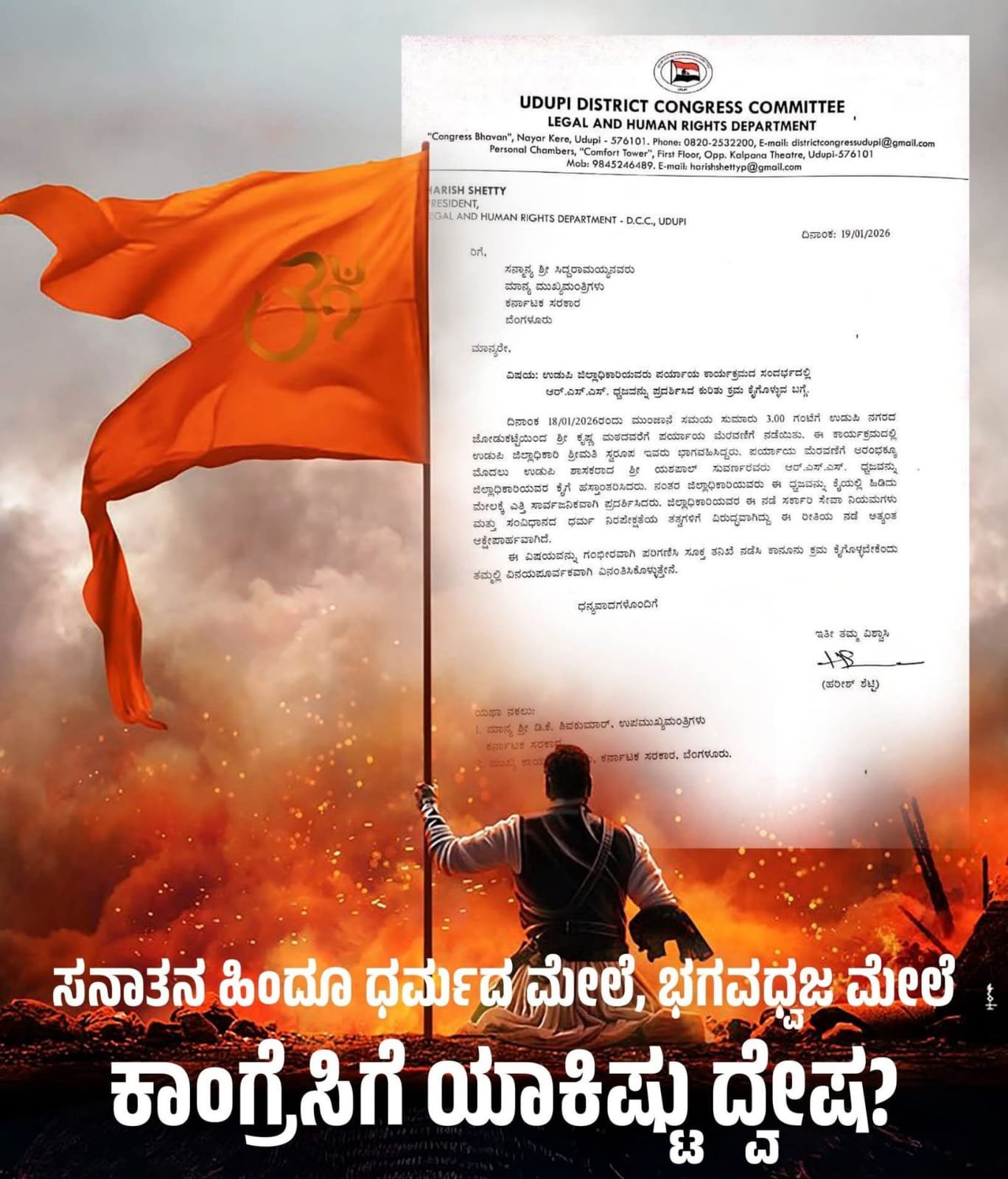 ಉಡುಪಿಯ ನಾಡಹಬ್ಬ ಪರ್ಯಾಯ ಮಹೋತ್ಸವದ ಸಂದರ್ಭದಲ್ಲಿ, ಜೋಡುಕಟ್ಟೆಯ ಮುಂಭಾಗದ ಭವ್ಯ ವೇದಿಕೆಯಲ್ಲಿ, ಅಷ್ಠಮಠಗಳ ಯತಿಗಳ ದಿವ್ಯ ಉಪಸ್ಥಿತಿಯಲ್ಲಿ ಮಾನ್ಯ ಉಡುಪಿ ಜಿಲ್ಲಾಧಿಕಾರಿಯವರು ಭಗವಾಧ್ವಜವನ್ನು ಹಾರಿಸುವ ಮೂಲಕ ಸಾಂಪ್ರದಾಯಿಕ ಪರ್ಯಾಯ ಮೆರವಣಿಗೆಗೆ ಚಾಲನೆ ನೀಡಿದ ಬಗ್ಗೆ ಉಡುಪಿ ಜಿಲ್ಲಾ ಕಾಂಗ್ರೆಸ್ ಕಾನೂನು ಮತ್ತು ಮಾನವ ಹಕ್ಕು ಘಟಕವು ಜಿಲ್ಲಾಧಿಕಾರಿಗಳ ವಿರುದ್ಧ ಕಾನೂನು ಕ್ರಮ ಕೈಗೊಳ್ಳಬೇಕು ಎಂದು ಮುಖ್ಯಮಂತ್ರಿ, ಉಪ ಮುಖ್ಯಮಂತ್ರಿ ಹಾಗೂ ಸರಕಾರದ ಮುಖ್ಯ ಕಾರ್ಯದರ್ಶಿಗಳಿಗೆ ಪತ್ರ ಬರೆದು ಆಗ್ರಹ ಮಾಡಿದೆ. ಪ್ರತಿ ಬಾರಿ ಜಿಲ್ಲಾ ಉಸ್ತುವಾರಿ ಸಚಿವರು ಪರ್ಯಾಯ ಮೆರವಣಿಗೆಗೆ ಚಾಲನೆ ನೀಡುವುದು ವಾಡಿಕೆ. ಈ ಬಾರಿ ಜಿಲ್ಲಾ ಉಸ್ತುವಾರಿ ಸಚಿವರು ಅನಿವಾರ್ಯ ಕಾರಣಗಳಿಂದ ಕಾರ್ಯಕ್ರಮದಲ್ಲಿ ಭಾಗಿಯಾಗದ ಕಾರಣ ಅವರ ಅನುಪಸ್ಥಿತಿಯಲ್ಲಿ ಜಿಲ್ಲಾಧಿಕಾರಿಗಳು ಚಾಲನೆ ನೀಡಿದ್ದಾರೆ. ಕಾಂಗ್ರೆಸ್ ಪಕ್ಷವು ಜಿಲ್ಲಾಧಿಕಾರಿಗಳು ಭಗವಾಧ್ವಜ ಹಾರಿಸಿದ್ದನ್ನು ಮಹಾಪ್ರಮಾದ ಎಂಬಂತೆ ಬಿಂಬಿಸಿ ಜಿಲ್ಲಾಧಿಕಾರಿಗಳ ವಿರುದ್ಧ ಆಕ್ರೋಶ ವ್ಯಕ್ತಪಡಿಸುತ್ತಿದ್ದಾರೆ. ಕೇವಲ ಭಗವಾಧ್ವಜವನ್ನು ಹಾರಿಸಿದರು ಎಂಬ ಏಕೈಕ ಕಾರಣಕ್ಕಾಗಿ ಜಿಲ್ಲಾಧಿಕಾರಿಗಳ ವಿರುದ್ಧ ಕ್ರಮಕ್ಕೆ ಆಗ್ರಹಿಸುವ ಮೂಲಕ ಹಿಂದೂಗಳ ಪವಿತ್ರ ಭಗವಾಧ್ವಜ ಬಗ್ಗೆ ಕಾಂಗ್ರೆಸ್ ಪಕ್ಷಕ್ಕೆ ಎಷ್ಟು ಧ್ವೇಷವಿದೆ ಎಂಬುದನ್ನು ತೋರಿಸಿ ಕೊಟ್ಟಿದ್ದಾರೆ. ಒಂದು ವೇಳೆ ಜಿಲ್ಲಾ ಉಸ್ತುವಾರಿ ಸಚಿವರೇ ಭಗವಾಧ್ವಜವನ್ನು ಹಾರಿಸಿ ಪರ್ಯಾಯ ಮೆರವಣಿಗೆಗೆ ಚಾಲನೆ ನೀಡುತ್ತಿದ್ದರೆ ಕಾಂಗ್ರೆಸ್ ಪಕ್ಷವು ಅವರ ರಾಜೀನಾಮೆಗೆ ಆಗ್ರಹಿಸುತ್ತಿತ್ತೆ? ಎಂದು ಅವರು ಪ್ರಶ್ನಿಸಿದ್ದಾರೆ.