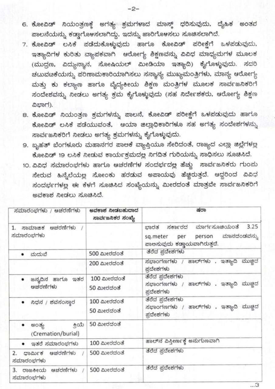 ಹೆಚ್ಚಿನ ಜನಸಂದಣಿ ತಡೆಗಟ್ಟಲು ಮದುವೆ ಇನ್ನಿತರ ಆಚರಣೆ, ಧಾರ್ಮಿಕ, ರಾಜಕೀಯ ಸಭೆ-ಸಮಾರಂಭಗಳಿಗೆ ನೂತನ ನಿಯಮಗಳನ್ನು ಜಾರಿ ಮಾಡಲಾಗಿದೆ.@DHFWKA pic.twitter.com/fdq8vH6wvE