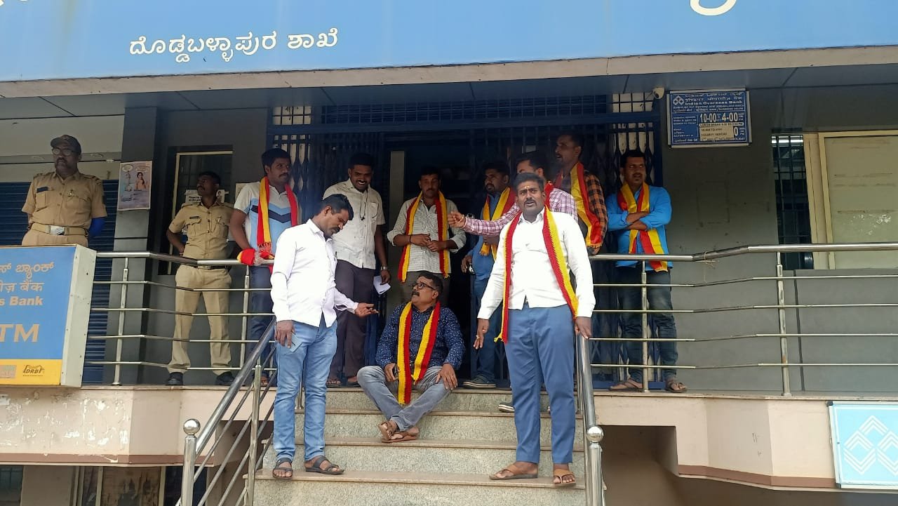 ಬೆಂಗಳೂರು: ದೊಡ್ಡಬಳ್ಳಾಪುರ ನಗರದ ತಾಲ್ಲೂಕು ಕಚೇರಿ ರಸ್ತೆಯಲ್ಲಿರುವ ಇಂಡಿಯನ್ ಓವರಸೀಸ್ ಬ್ಯಾಂಕಿನ ಮ್ಯಾನೇಜರ್ ಕನ್ನಡದಲ್ಲಿ ವ್ಯವಹಾರಿಸದೆ, ದರ್ಪ ಮೆರೆದು ಬ್ಯಾಂಕಿನ ಗ್ರಾಹಕ ನೀಡಿದ ಚೆಕ್ ಅನ್ನು ಬಿಸಾಡಿ ಕನಿಷ್ಟ ಗೌರವದಿಂದ ನಡೆದುಕೊಳ್ಳದೆ ಅಪಮಾನ ಮಾಡಿದ್ದಾರೆ ಎಂದು ಆರೋಪಿಸಿ ಕರವೇ (ಕನ್ನಡಿಗರ ಬಣ) ಅಧ್ಯಕ್ಷ ಚಂದ್ರಶೇಖರ್ ಬ್ಯಾಂಕ್ ಮುಂಭಾಗ ಬಾಗಿಲಿನಲ್ಲೇ ಕುಳಿತು ಪ್ರತಿಭಟನೆ ಮಾಡಿದ ಪ್ರಸಂಗ ಸೋಮವಾರ ನಡೆದಿದೆ.