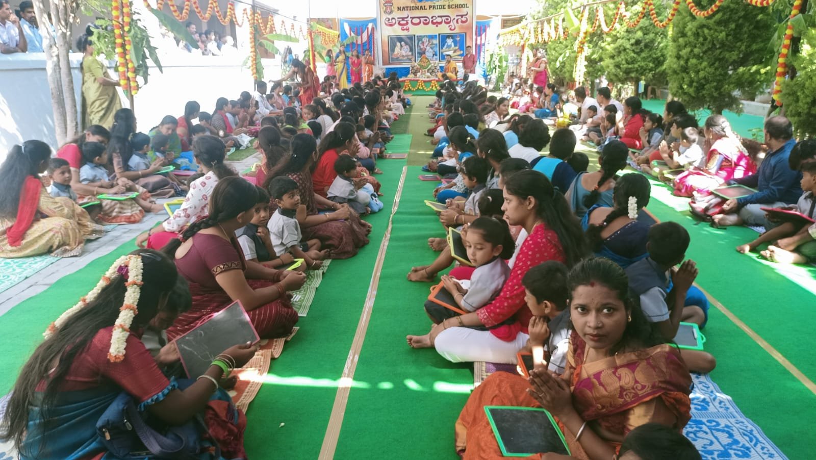 ಮಕ್ಕಳ ಜೊತೆ ಕುಳಿತ ಪೋಷಕರು ಸ್ಲೇಟ್‌ನಲ್ಲಿ ತಮ್ಮ ಮಕ್ಕಳಿಗೆ ಅಕ್ಷರಾಭ್ಯಾಸ ಮಾಡಿಸಿದರು, ಮೊದಲ ಅಕ್ಷರವಾಗಿ ಮಕ್ಕಳು ಕನ್ನಡ ವರ್ಣಮಾಲೆಯ ‘ಅಆಇಈ’ಯನ್ನ ಸ್ಲೇಟ್‌ನಲ್ಲಿ ಬರೆದು ಶಾಸ್ತ್ರೋದಕವಾಗಿ ಶಾಲೆಯ ಮೊದಲ ದಿನ ಆರಂಭಿಸಿದರು.