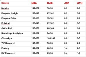 - ಪೀಪಲ್ಸ್ ಪಲ್ಸ್: NDA – 133-159 | ಮಹಾಘಟಬಂಧನ್ – 75-101 | ಜನ ಸುರಾಜ್ – 0-5 | ಇತರರು – 2-8