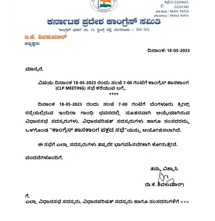 ಮುಖ್ಯಮಂತ್ರಿ ಸ್ಥಾನಕ್ಕೆ ನಾಯಕನ ಆಯ್ಕೆ ಸಂಬಂಧ ಹಲವು ದಿನಗಳಿಂದ ಕಾಂಗ್ರೆಸ್‌ನಲ್ಲಿ ಸರ್ಕಸ್ ನಡೆದಿದ್ದು ಅಂತಿಮವಾಗಿ ಇಂದು ಸಂಜೆ ಬೆಂಗಳೂರಿನಲ್ಲಿ ಕಾಂಗ್ರೆಸ್ ಶಾಸಕಾಂಗ ಪಕ್ಷದ ಸಭೆ ಕರೆಯಲಾಗಿದೆ. ಬೆಂಗಳೂರಿನಲ್ಲಿರುವ ಕೆಪಿಸಿಸಿ ಕಚೇರಿ ಇಂದಿರಾ ಗಾಂಧಿ ಭವನದಲ್ಲಿ ಈ ಸಭೆ ನಡೆಯಲಿದ್ದು ವಿಧಾನಸಭೆಗೆ ಆಯ್ಕೆಯಾಗಿರುವ ಎಲ್ಲಾ ಸದಸ್ಯರಿಗೆ, ವಿಧಾನಪರಿಷತ್ ಸದಸ್ಯರಿಗೆ, ಸಂಸದರಿಗೆ ಬುಲಾವ್ ನೀಡಲಾಗಿದೆ. ಎಲ್ಲಾ ಶಾಸಕರು ಸಂಸದರು ಈ ಸಭೆಯಲ್ಲಿ ಭಾಗವಹಿಸುವಂತೆ ಕೆಪಿಸಿಸಿ ಅಧ್ಯಕ್ಷ ಡಿ.ಕೆ.ಶಿವಕುಮಾರ್ ಸಂದೇಶ ರವಾನಿಸಿದ್ದಾರೆ.