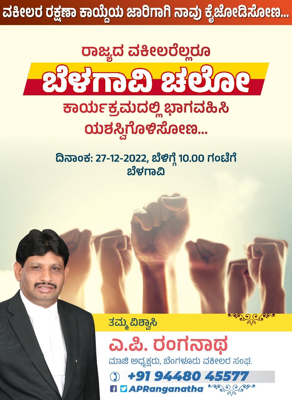 ವಕೀಲರ ಈ ಹೋರಾಟ ಕುರಿತಂತೆ ಮಾಹಿತಿ ಹಂಚಿಕೊಂಡಿರುವ ಎ.ಪಿ.ರಂಗನಾಥ್, ಡಿಸೆಂಬರ್ 27ರಂದು ಬೆಳಿಗ್ಗೆ ಬೆಳಗಾವಿಯಲ್ಲಿ ಜಮಾಯಿಸಿ ಹೋರಾಟ ನಡೆಸಲಾಗುವುದು. ಈ ‘ಬೆಳಗಾವಿ ಚಲೋ’ದಲ್ಲಿ ರಾಜ್ಯದ ವಕೀಲರೆಲ್ಲರೂ ಭಾಗವಹಿಸಬೇಕೆಂದು ಮನವಿ ಮಾಡಿದ್ದಾರೆ.
