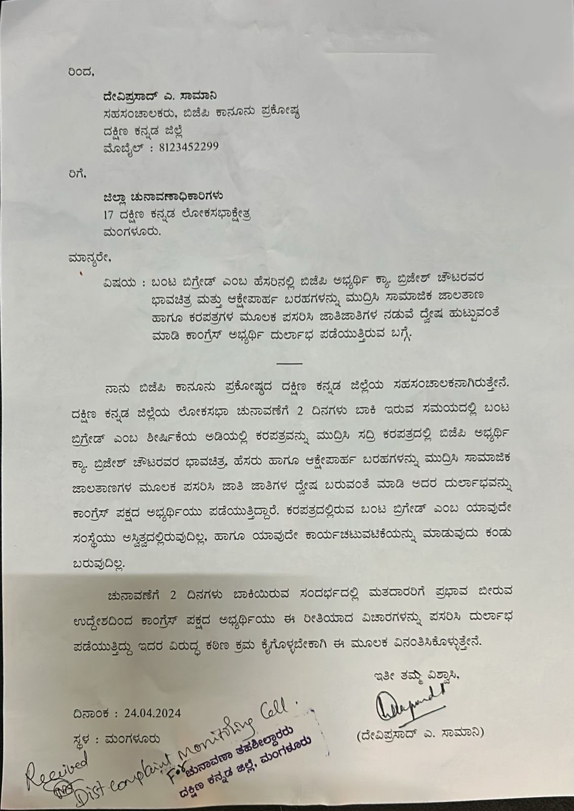 ಬಂಟ ಬಿಗ್ರೇಡ್ ಎಂಬ ಹೆಸರಿನಲ್ಲಿ ಬಿಜೆಪಿ ಅಭ್ಯರ್ಥಿ ಕ್ಯಾ. ಬ್ರಿಜೇಶ್ ಚೌಟರವರ ಭಾವಚಿತ್ರ ಮತ್ತು ಆಕ್ಷೇಪಾರ್ಹ ಬರಹಗಳನ್ನು ಮುದ್ರಿಸಿ ಸಾಮಾಜಿಕ ಜಾಲತಾಣ ಹಾಗೂ ಕರಪತ್ರಗಳ ಮೂಲಕ ಪಸರಿಸಿ ಜಾತಿಜಾತಿಗಳ ನಡುವೆ ದ್ವೇಷ ಹುಟ್ಟುವಂತೆ ಮಾಡಿ ಕಾಂಗ್ರೆಸ್ ಅಭ್ಯರ್ಥಿ ದುರ್ಲಾಭ ಪಡೆಯುತ್ತಿದ್ದಾರೆ ಎಂದು ದೇವಿಪ್ರಸಾದ್ ಎ. ಸಾಮಾನಿ ದೂರಿನಲ್ಲಿ ಉಲ್ಲೇಖಿಸಿದ್ದಾರೆ.