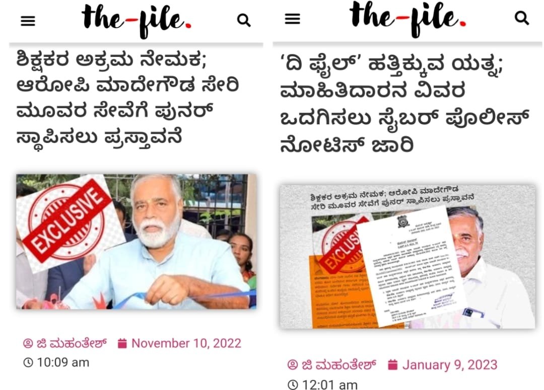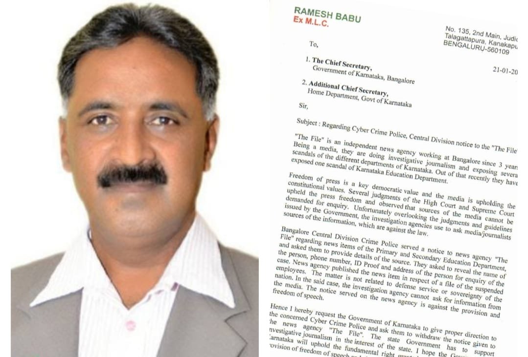 ‘The File’ ಮಾಧ್ಯಮವು ಪ್ರಾಥಮಿಕ ಹಾಗೂ ಪ್ರೌಢ ಶಿಕ್ಷಣ ಇಲಾಖೆಯ ಸುದ್ದಿ ಬಗೆಗಿನ ಮಾಹಿತಿಯ ಮೂಲವನ್ನು ಕೇಳಲು ಬೆಂಗಳೂರು ಸೈಬರ್ ಕ್ರೈಂ, ಕೇಂದ್ರ ವಿಭಾಗದ ಪೊಲೀಸರು ನೊಟೀಸ್ ನೀಡಿ ಅಧಿಕಾರ ಪ್ರಯೋಗಿಸಿದ್ದಾರೆ. ಸುದ್ದಿಗೆ ಸಂಬಂಧಿಸಿದ ಮಾಹಿತಿದಾರರ ಹೆಸರು, ಫೋನ್ ನಂಬರ್, ಗುರುತಿನ ಚೀಟಿ, ವಿಳಾಸ ನೀಡುವಂತೆ ಪೊಲೀಸರು ನೊಟೀಸ್ ನೀಡಿದ್ದಾರೆ. ನೇಮಕಾತಿ ಅಕ್ರಮದ ಆರೋಪದಲ್ಲಿ ಅಮಾನತುಗೊಂಡಿರುವವರನ್ನು ಸೇವೆಗೆ ಮರುಸ್ಥಾಪಿಸುವ ಪ್ರಕ್ರಿಯೆ ಬಗ್ಗೆ ‘The File’ ಮಾಧ್ಯಮವು ವರದಿ ಮಾಡಿದೆಯೇ ಹೊರತು ರಕ್ಷಣಾ ಸೇವೆ ಅಥವಾ ದೇಶದ ಭದ್ರತೆಗೆ ಧಕ್ಕೆ ತರುವಂತಹಾ ಕೃತಿ ಮಾಡಿಲ್ಲ. ಹಾಗಾಗಿ ಮಾಧ್ಯಮಗಳ ವಿರುದ್ದ ಪೊಲೀಸರ ಇಂತಹ ನಡೆ ಆಕ್ಷೇಪಾರ್ಹ ಎಂಬುದನ್ನು ರಮೇಶ್ ಬಾಬು ಒತ್ತಿ ಹೇಳಿದ್ದಾರೆ.