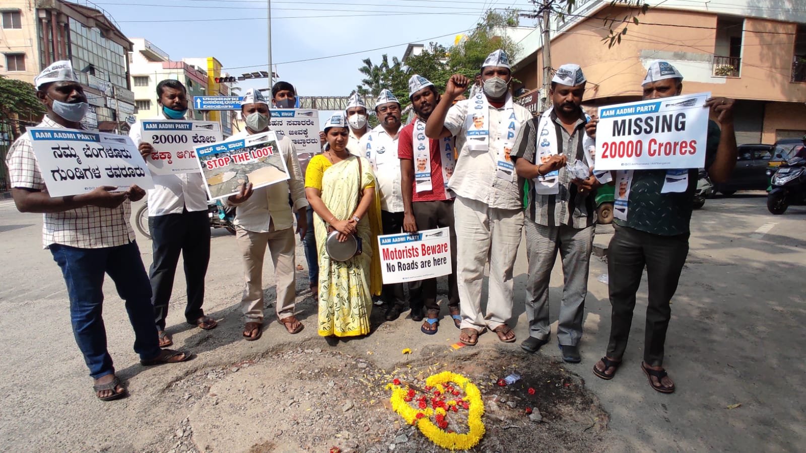ಇದು ಆಮ್ ಆದ್ಮಿ ಪಾರ್ಟಿಯು ಬುಧವಾರ ಬೆಂಗಳೂರಿನಾದ್ಯಂತ ಹಮ್ಮಿಕೊಂಡಿದ್ದ ರಸ್ತೆಗುಂಡಿ ಹಬ್ಬ ಕಾರ್ಯಕ್ರಮದಲ್ಲಿ ಕಂಡುಬಂದ ದೃಶ್ಯ.